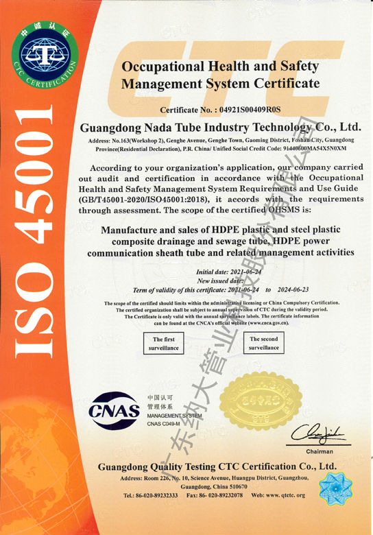 廣東納大管業(yè)科技股份有限公司通過ISO9001安全管理體系